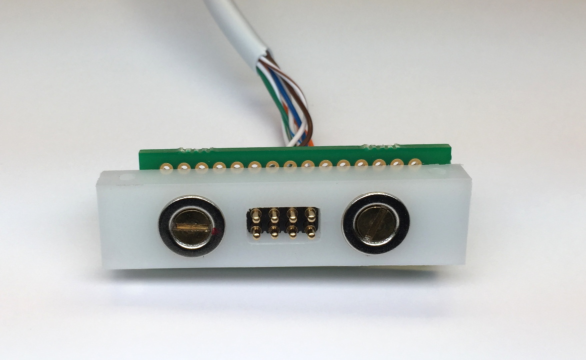 The white acetal blocks are 0.5 by 2.0 inches and the pin spacing is 0.1 inches. The parts cost for the prototype is around $15. I went with the concave target pins instead of the flat ones for the vehicle side because I thought they would be better for the battery charging connections. The contacts are rated at 2 A continuous, 3 A peak. The spring loaded pins have a travel of 0.055 inches with a spring force of .15 lbf at mid-deflection so a connector with 8 of them needs at least 1.1 lbf of compression to hold it together. The magnets have a spec of 4.2 lbf but it's not clear if that's with another magnet or a steel plate.