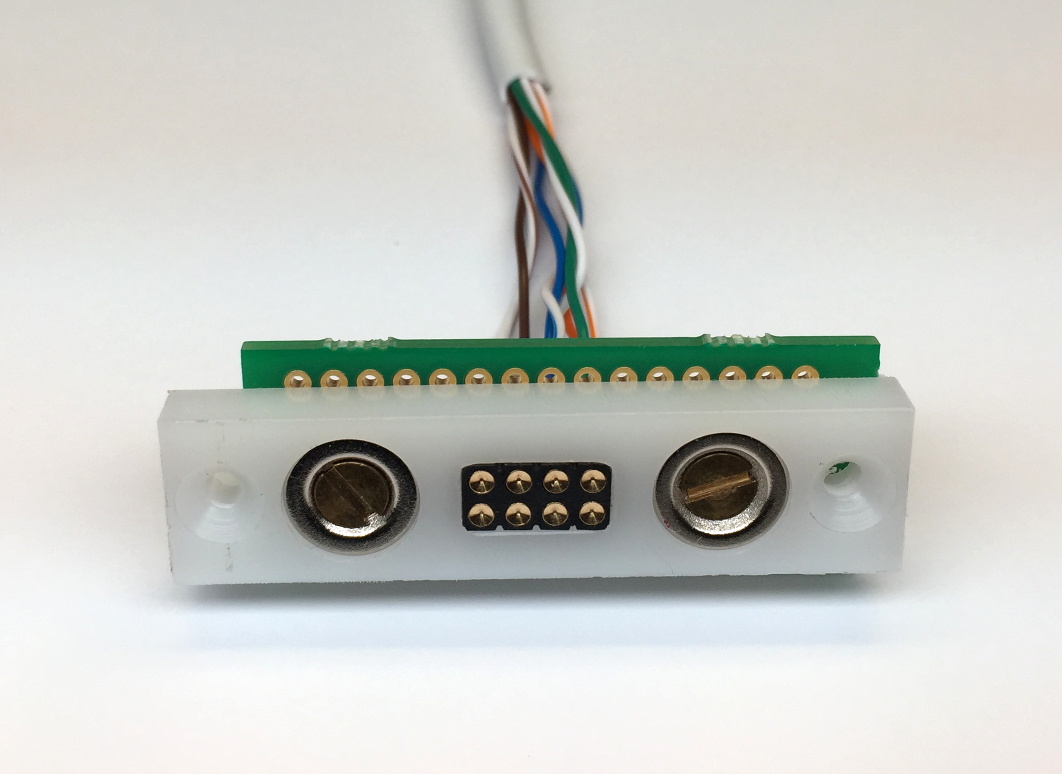 For breakaway connectors on my rocket, I had originally planned to use DE-9 connectors and RJ-45 jacks w/o the tab. But I was having trouble figuring out to keep the protuberances to a minimum and I didn't like the the off-axis loads on the pins and shells. I remembered the MagSafe connectors for Apple laptops but I couldn't find anything off the shelf that was: 1) orderable, 2) had enough pins, and 3) was easy to integrate into the skin of a rocket.