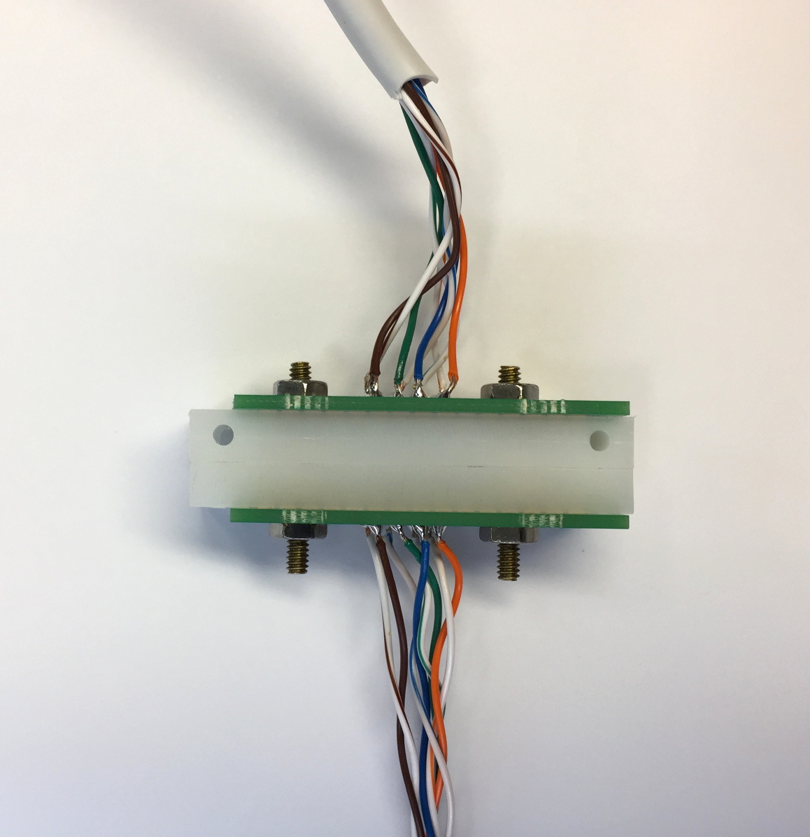 To register the two assemblies together, I recessed the magnets by 0.02 inches on the vehicle connector and then let the magnets protrude an equivalent amount on the removable connector. The magnets are strong enough that if you get them anywhere close to each other, they just want to snap in place. Opposite polarity magnets on each end of each connector allow it to be assembled in only one orientation. I drilled two holes in each end of the removable portion to attach a lanyard so when the vehicle lifts off, it won't pull on the wires. The two halves separate cleanly as expected. To test the signal integrity of the connector, I cut a network cable in two and wired it to each side. I'm only going to use it at 100Base-T speeds (and you only need 2 pair for that) but at GB speeds, iperf shows 894 Mb/s in one direction and 938 Mb/s in the other. The original unmodified CAT-5E cable ran at 938 Mb/s.